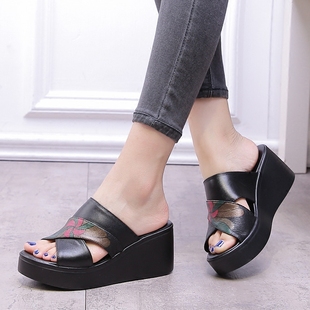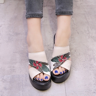 女式 典缀2025夏季 松糕坡跟露趾套脚拖鞋 厚底民族风女鞋 防水台 新品
