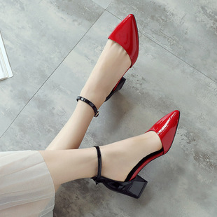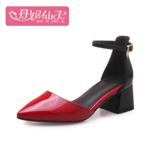 女夏季 子女鞋 新款 简约包头粗跟高跟鞋 真皮红色中空单鞋 一字带凉鞋