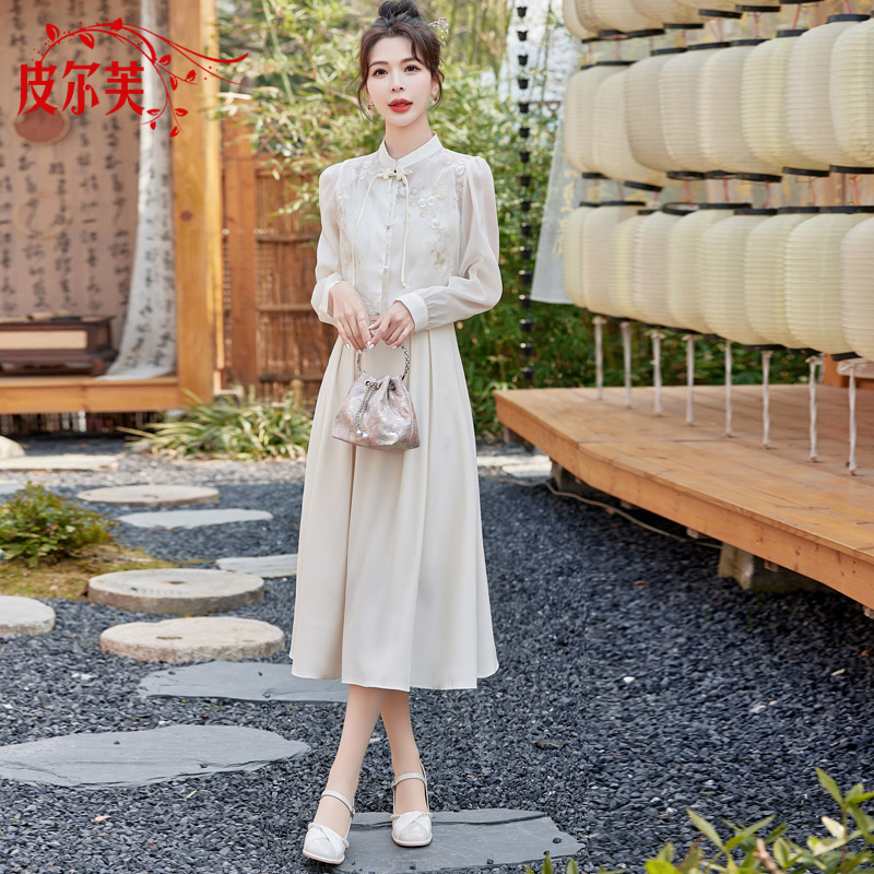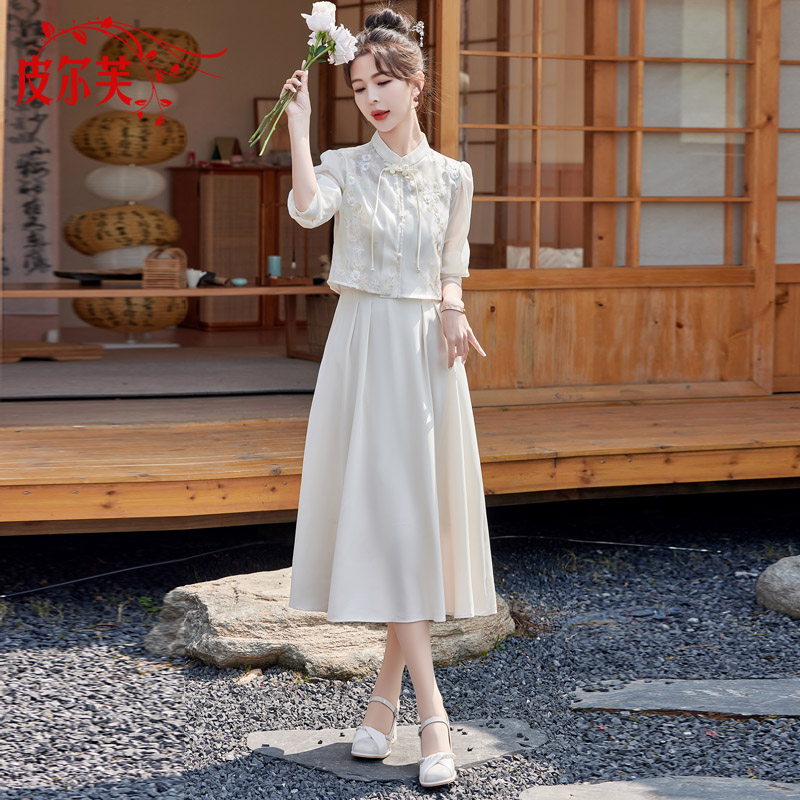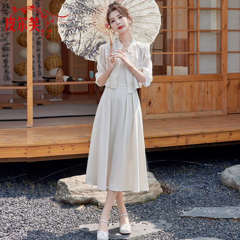 刺绣改良旗袍长袖 女秋夏新款 两件套 国风吊带连衣裙穿搭套装 新中式