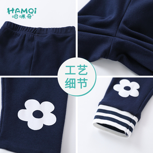 宽松直筒阔腿运动裤 新款 子 女秋季 藏青色苹果刺绣高腰抽绳休闲卫裤