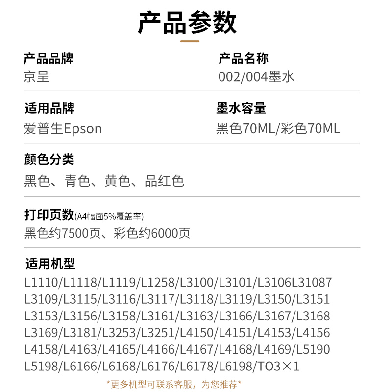 L4158 L1119非Epson L3119 L1118 L4166 L4168 L3158彩色L3250 L3153 L3151 002墨水L3118 京呈适用爱普生004