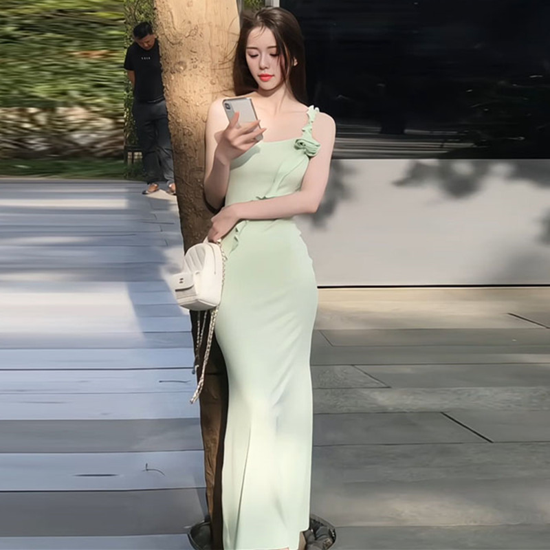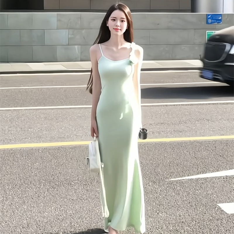 法式 纯欲甜辣风掐腰长裙 绝美漂亮曼波绿色吊带连衣裙女夏2025新款