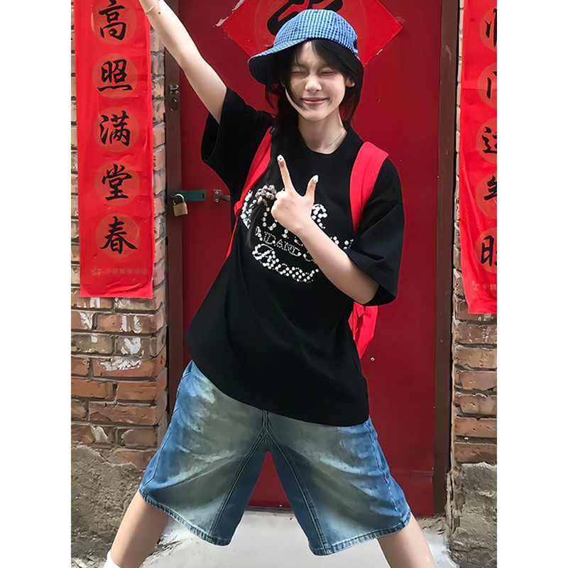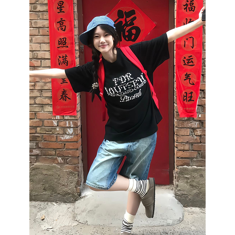 情侣百搭半截袖 小众钉珠字母刺绣短袖 高级感痞帅上衣美式 夏季 男款