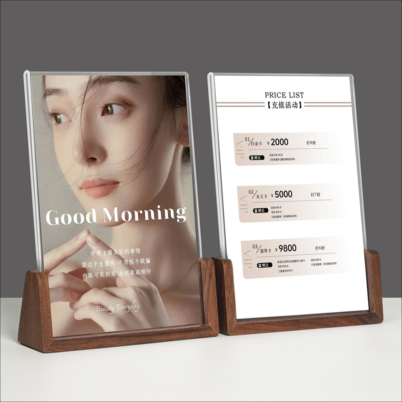 亚克力实木台卡立牌菜单价目价格表展示牌桌面台签摆摊广告牌理发店美容美发店摆台标价牌7寸a5水牌餐牌定制