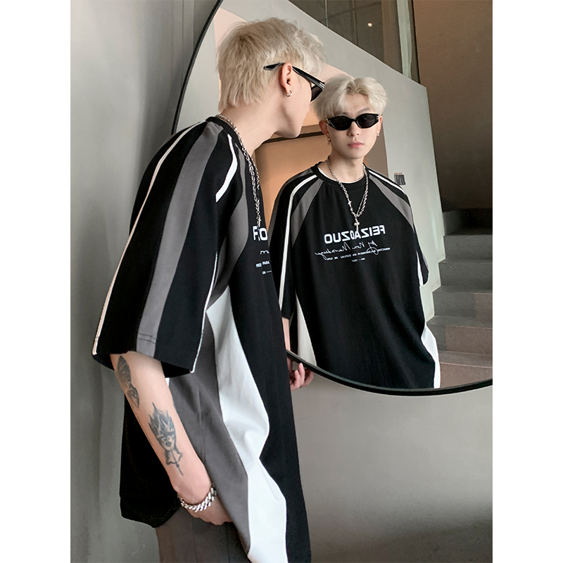 高街潮牌痞帅机车风条纹拼接宽松半袖 美式 衣服 t恤男2025夏季 短袖