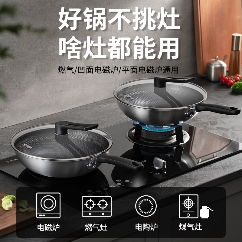苏泊尔不粘锅家用炒锅304不锈钢蜂窝不粘炒菜锅电磁炉燃气灶通用