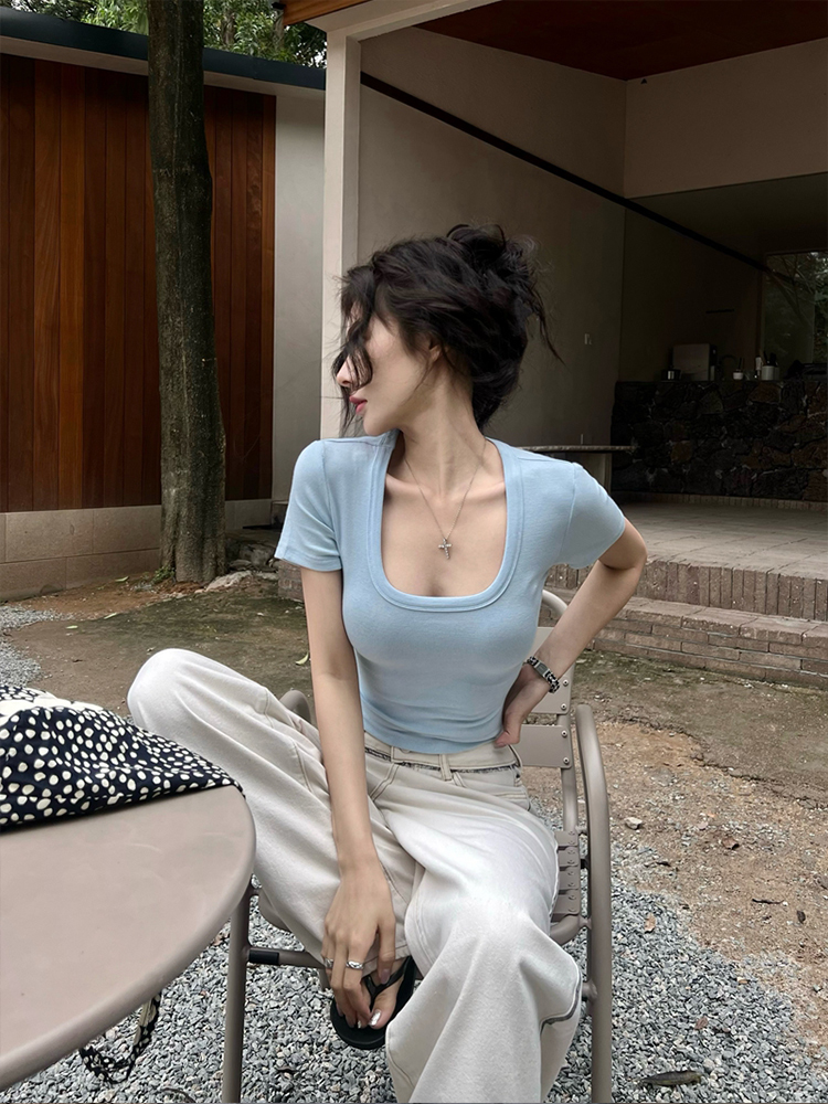 正肩低U领短袖 紧身修身 体恤纯欲露脐上衣 T恤女夏季 辣妹大领口短款