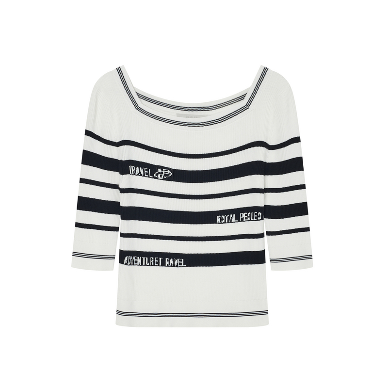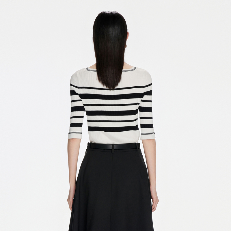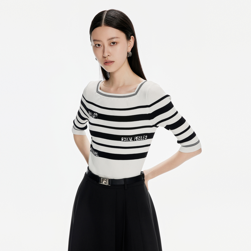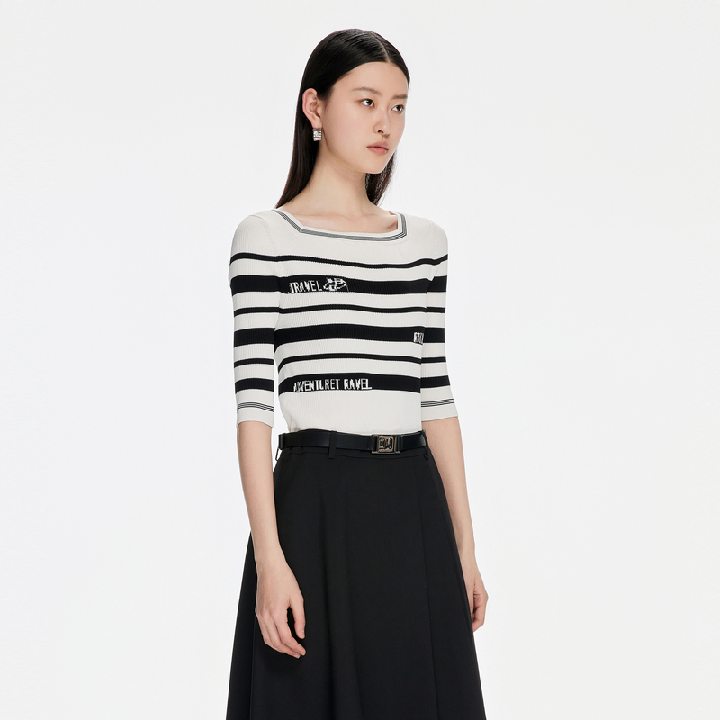 法式 新款 气质时尚 修身 飘蕾锁骨方领条纹针织衫 显瘦毛衫 女秋季