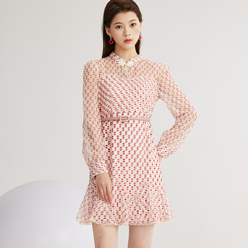 梵凯连衣裙浪漫心形印花春秋甜美气质长袖 鱼尾中裙小个子通勤裙子