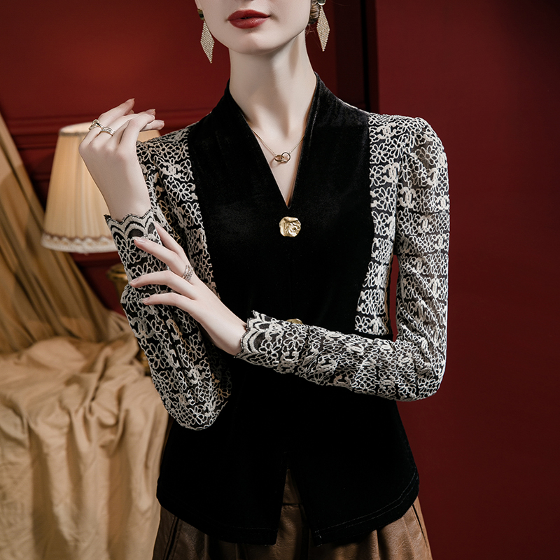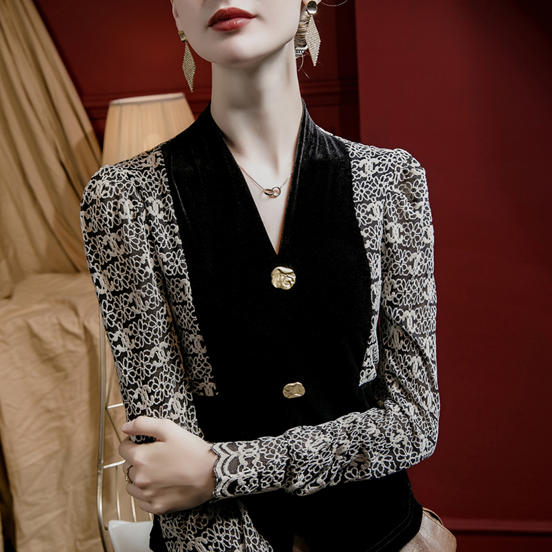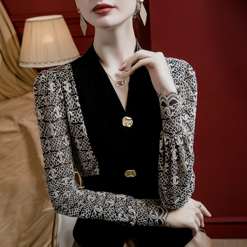 撞色蕾丝拼接纽扣洋气小衫 秋季 丝绒V领上衣女灯笼袖 2025春秋新款