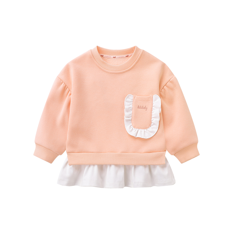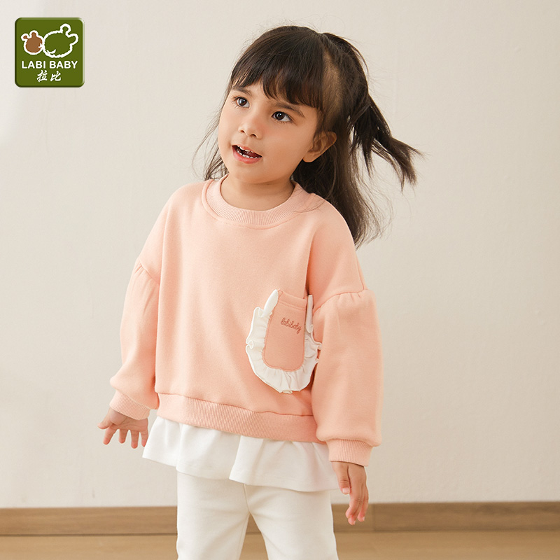 拉比童装 卫衣2025秋冬儿童圆领上衣假两件花边T恤女宝不倒绒卫衣