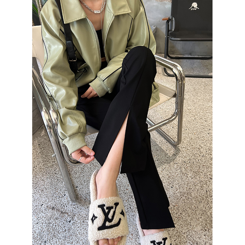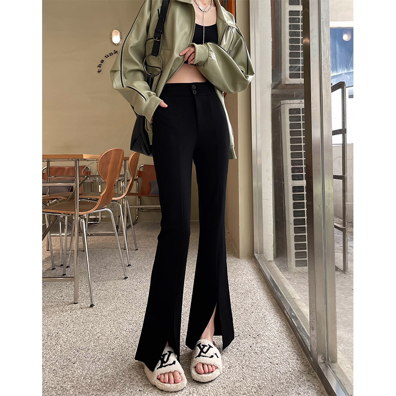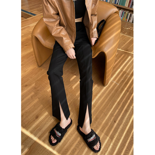 高腰休闲拖地长裤 显瘦小个子2023秋冬新款 女修身 黑色开叉微喇叭裤