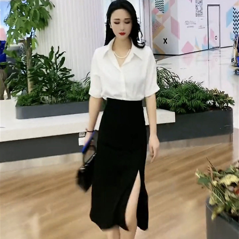 2022新款 开叉半身裙套装 OL气质简约纯色衬衫 小衫 女 翻领短袖 夏装