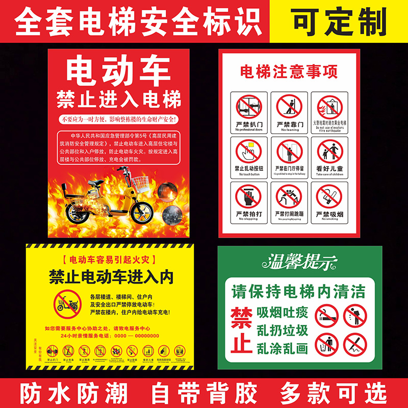 电梯警告标识小区物业电梯安全标识电梯使用方法方式 电梯注意事项禁止电瓶车进入禁止吸烟电梯使用安全须知