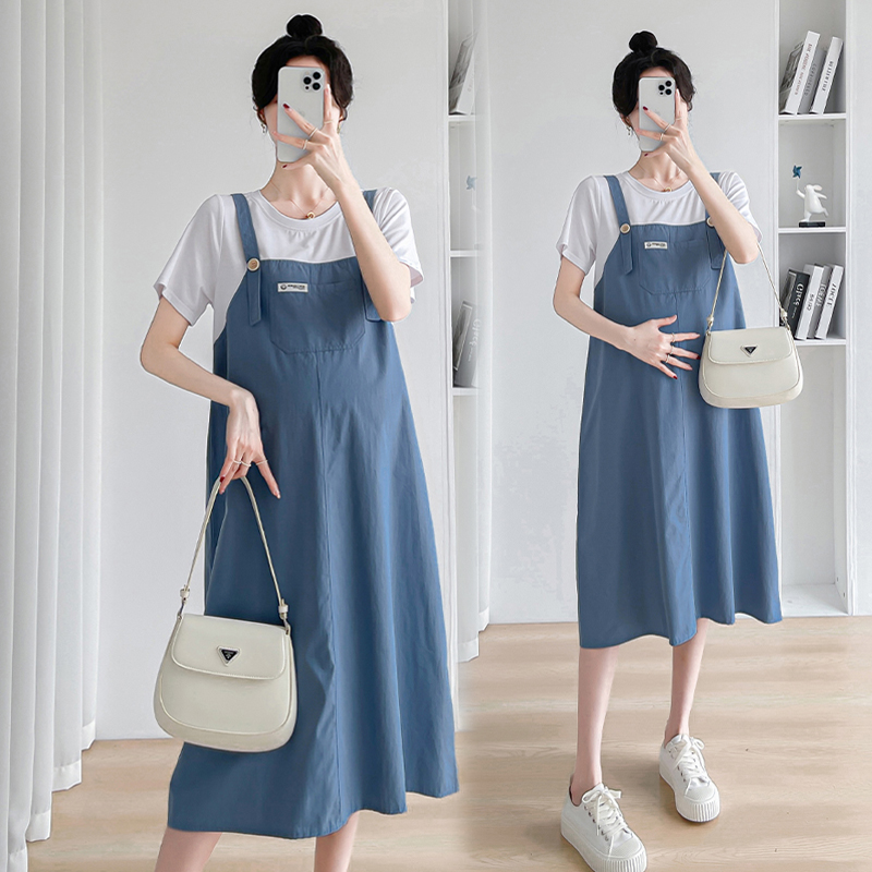 连衣裙中长款 薄款 2025新款 宽松假两件短袖 显瘦 蓝色孕妇装 孕妇夏装