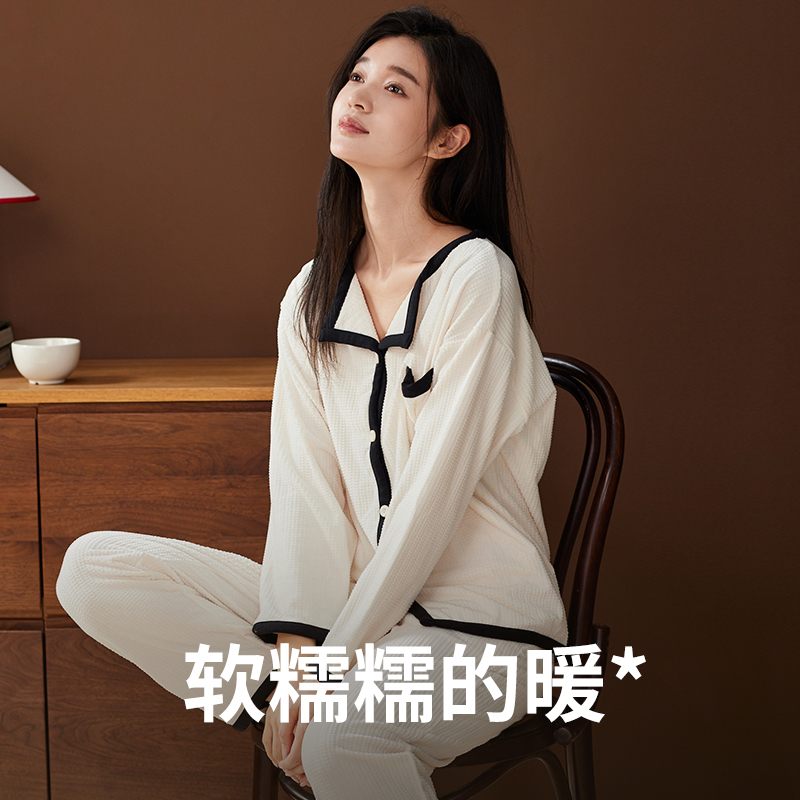 可外穿 翻领加厚保暖海岛绒家居服套装 秋鹿珊瑚绒睡衣女款 秋冬开衫