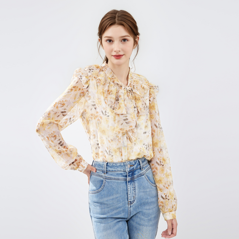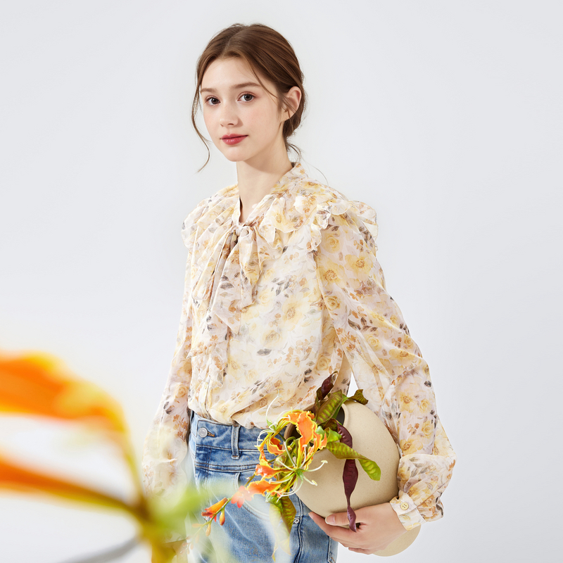 女荷叶边漂亮打底小衫 秋水伊人复古优雅碎花雪纺衬衫 2025春秋新款