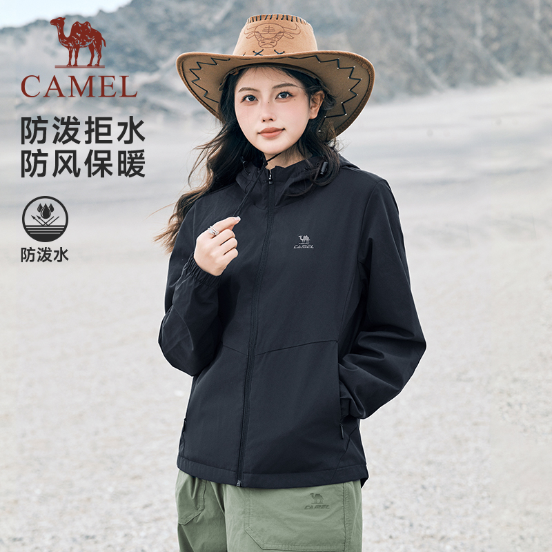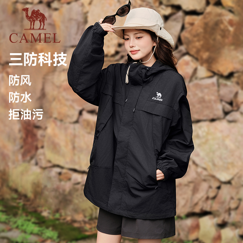 骆驼运动外套女秋季 黑色连帽风衣外套户外登山防水防风薄绒夹克男