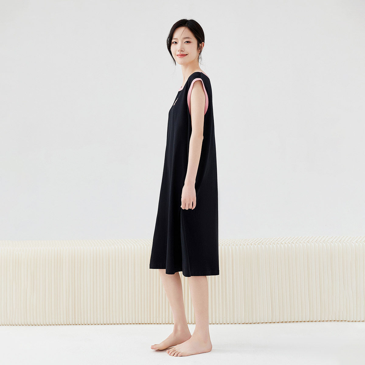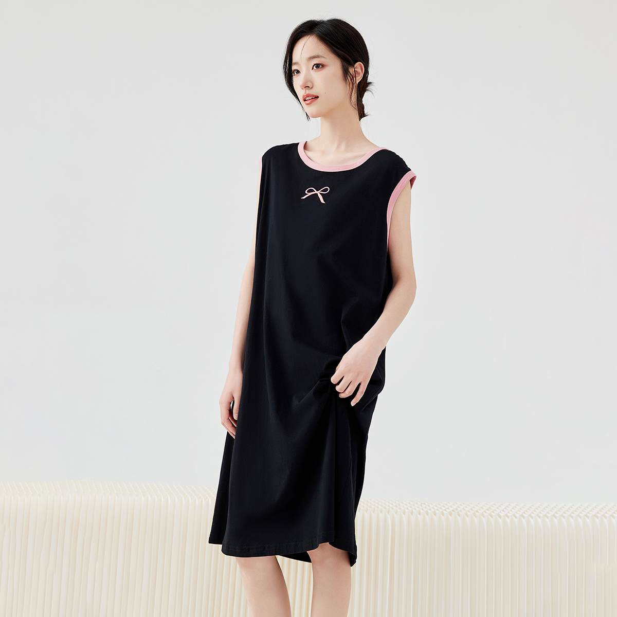 顶瓜瓜简约粉色撞色圆领顶呱呱汗布圆领蝴蝶结定位女士无袖 睡裙
