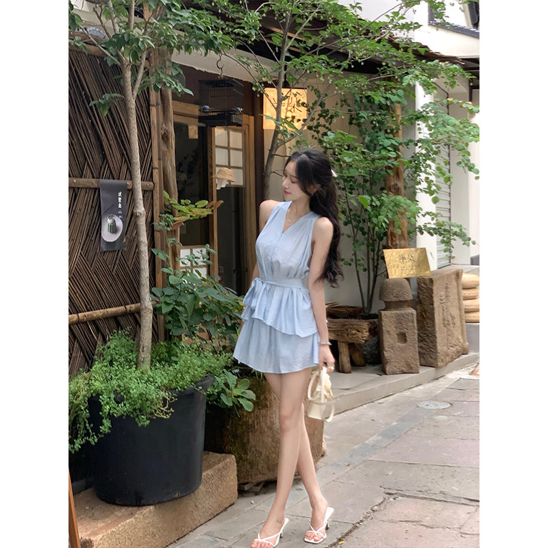 浅蓝色绑带无袖 高级时尚 V领上衣收腰长裤 女新款 两件套 套装 韩语琳