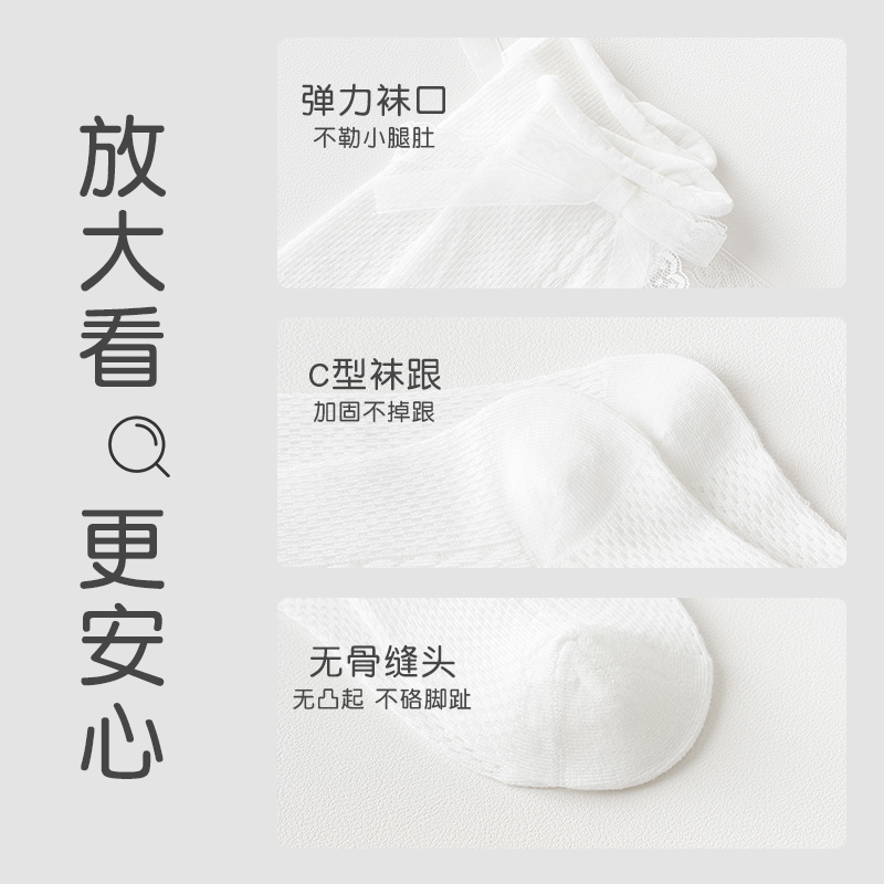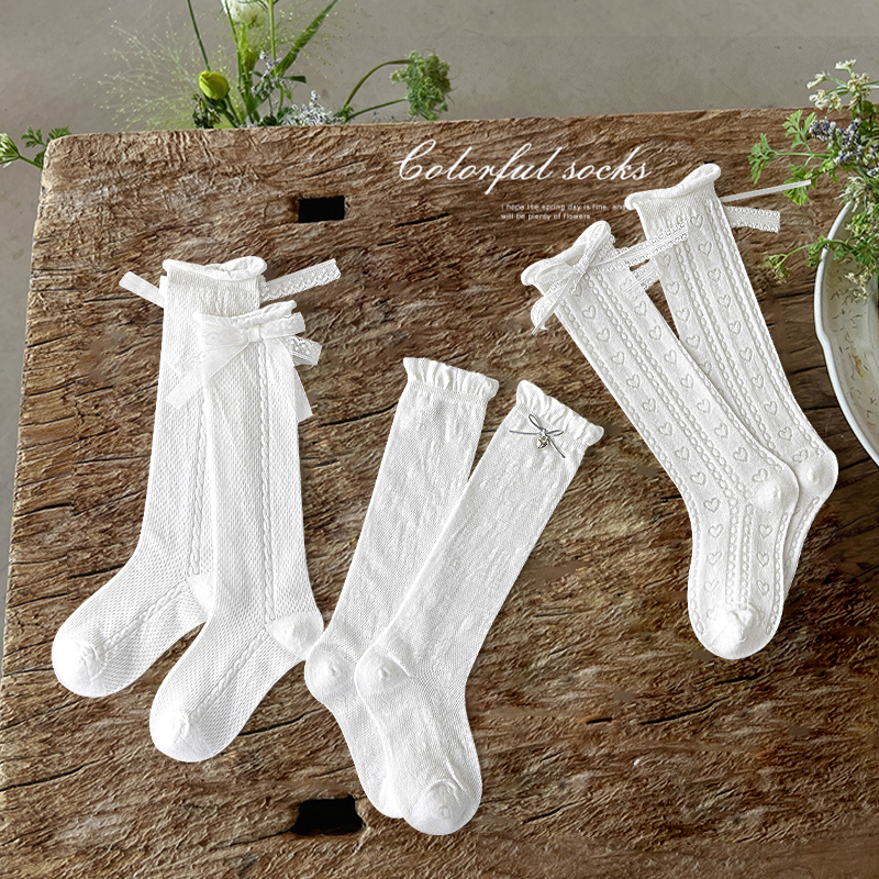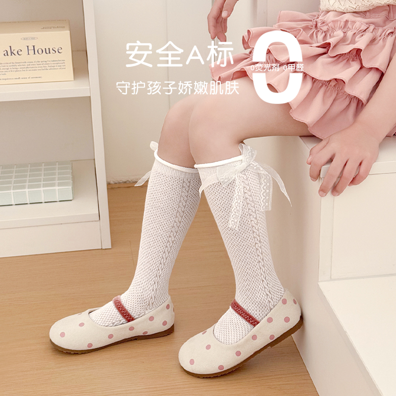 女童长筒袜子夏季 白色蝴蝶结花边无骨公主袜儿童网眼小腿袜 薄款
