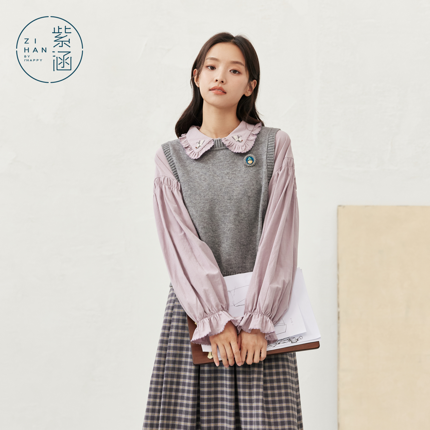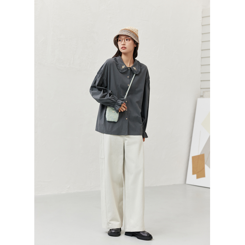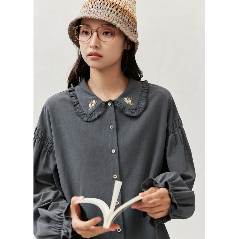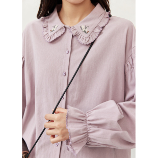 文艺气质宽松显瘦收褶长袖 新款 衬衣 女2025年秋季 紫涵刺绣翻领衬衫