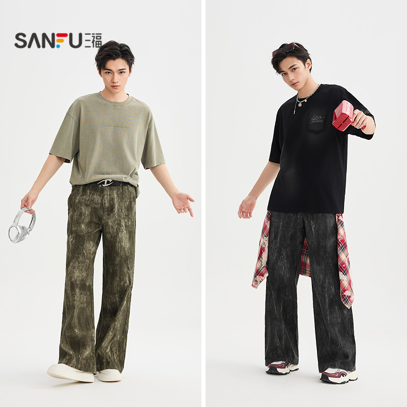 直腰长裤 街潮微喇阔版 506126 解构扎染休闲裤 三福2025秋冬男士