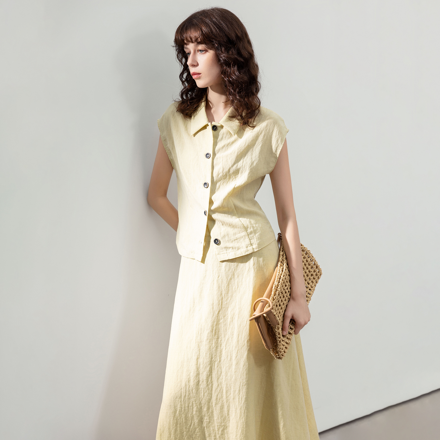 德玛纳莱赛尔亚麻气质小清新套装 上衣A字半身裙两件套 女翻领无袖
