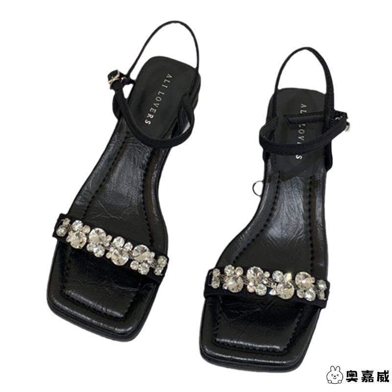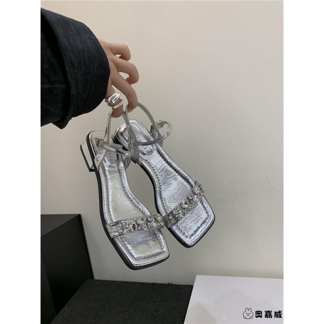 大码 女鞋 2024新款 秋季 法式 粗跟中跟露趾银色罗马鞋 水钻一字带凉鞋