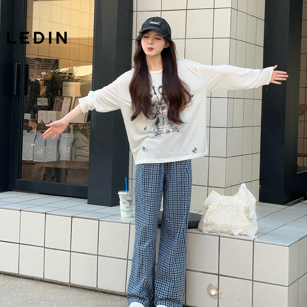 新款 秋季 乐町格子裤 蕾丝边格纹直筒阔腿松紧腰休闲裤 糖霜格蕾