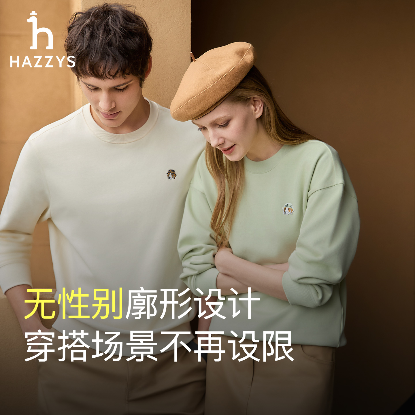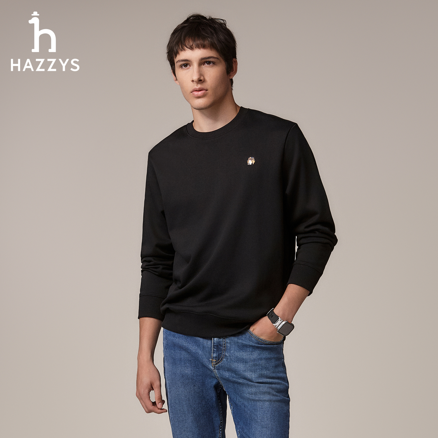 Hazzys哈吉斯男女长袖 纯色简约休闲宽松纯棉圆领卫衣 T恤上衣秋季