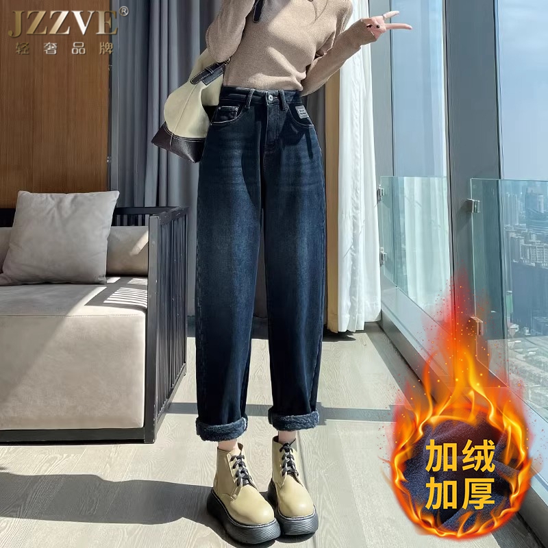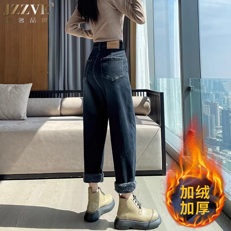 加厚高腰直筒萝卜宽松老爹裤 2024年新款 女秋冬哈伦裤 加绒牛仔裤