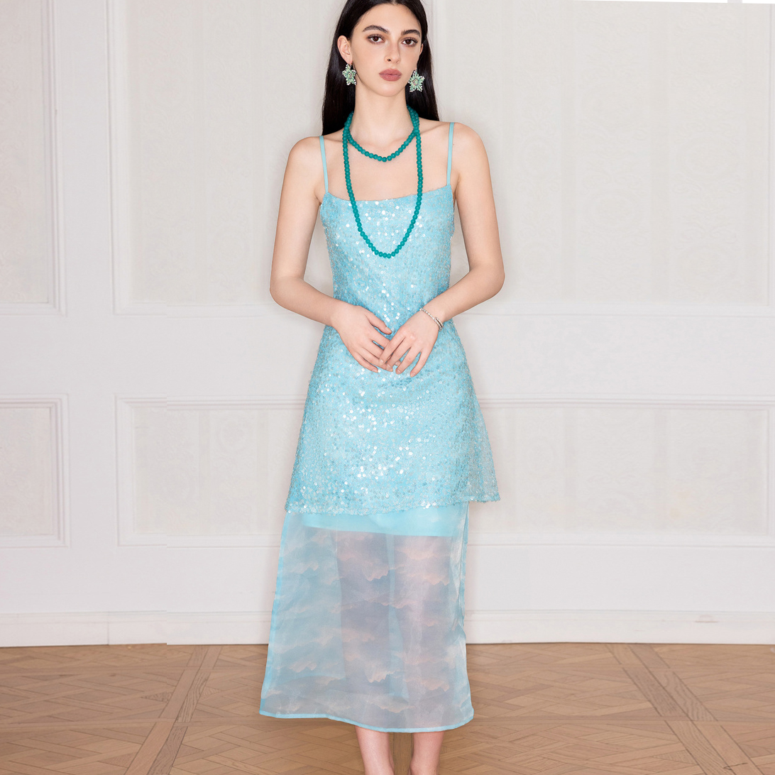 sparrowSS新款 Aimme 蓝色亮片晕染裙摆吊带裙 清货折`