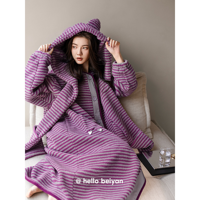 贝妍睡衣女款 保暖珊瑚绒晨袍带帽围巾条纹浴袍加厚羊羔绒睡袍 冬季