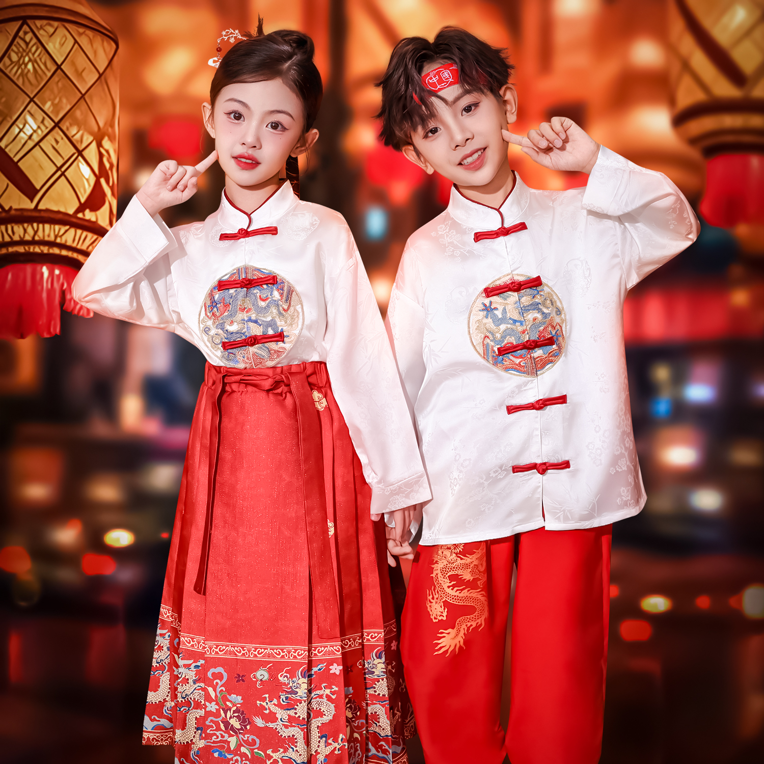 中国风儿童演出服2025新款 汉服男童合唱朗诵表演服 马面裙女童套装