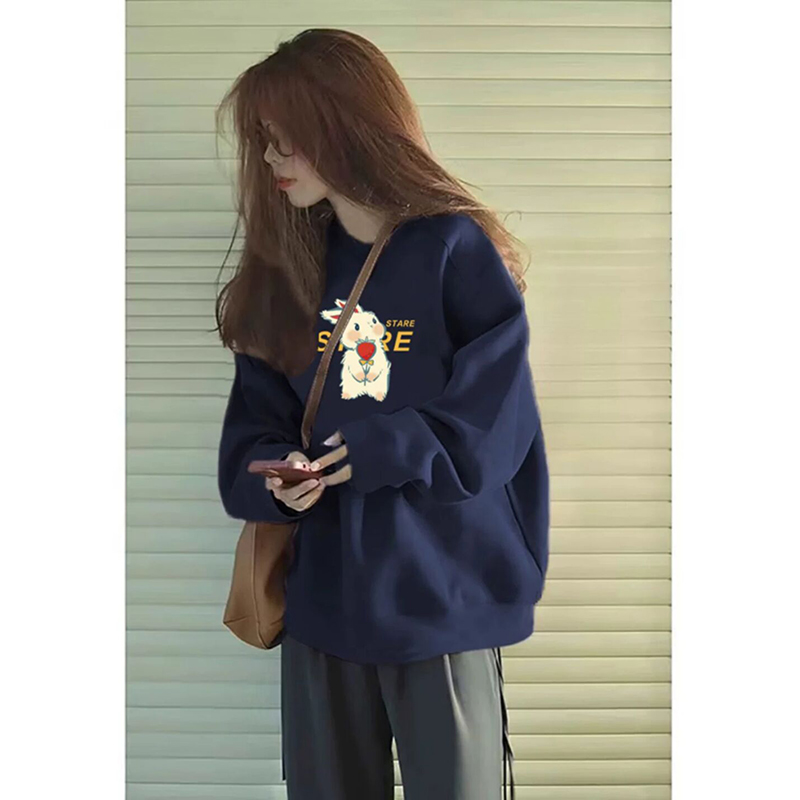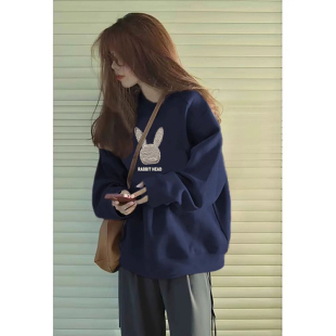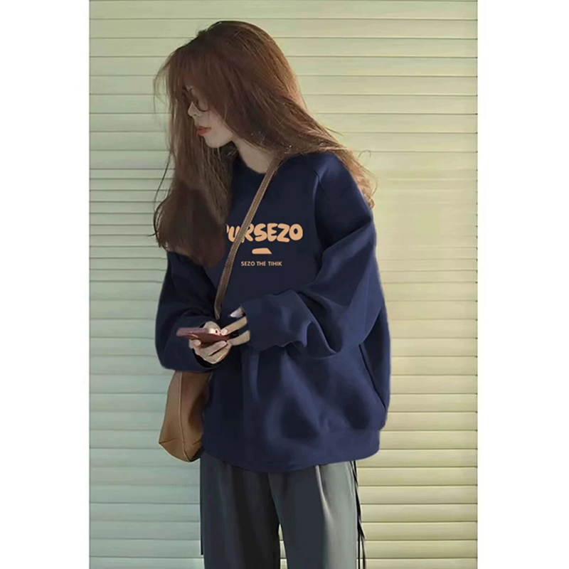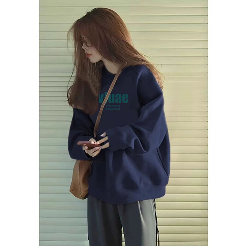 oversize韩版 秋冬2025新款 宽松加绒上衣 复古卫衣女款 藏蓝色美式
