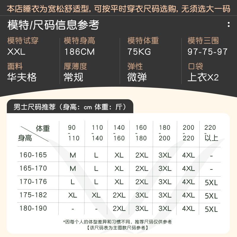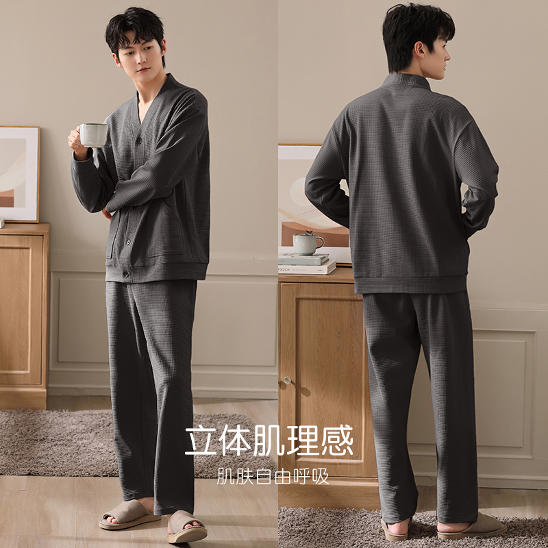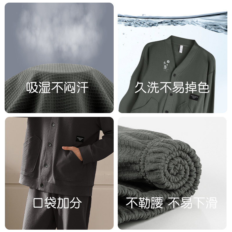 春秋季 套装 纯棉长袖 可外穿全棉家居服秋款 大码 轩靓华夫格睡衣男士
