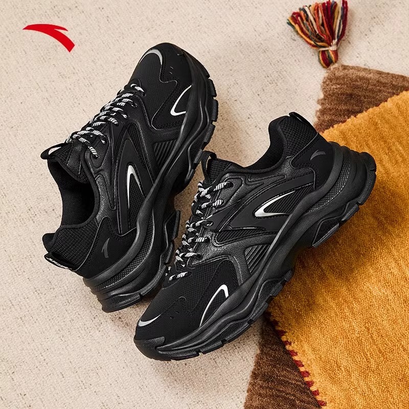 秋季 新款 官方正品 安踏男鞋 休闲跑步鞋 男款 黑色皮面男士 子男 运动鞋