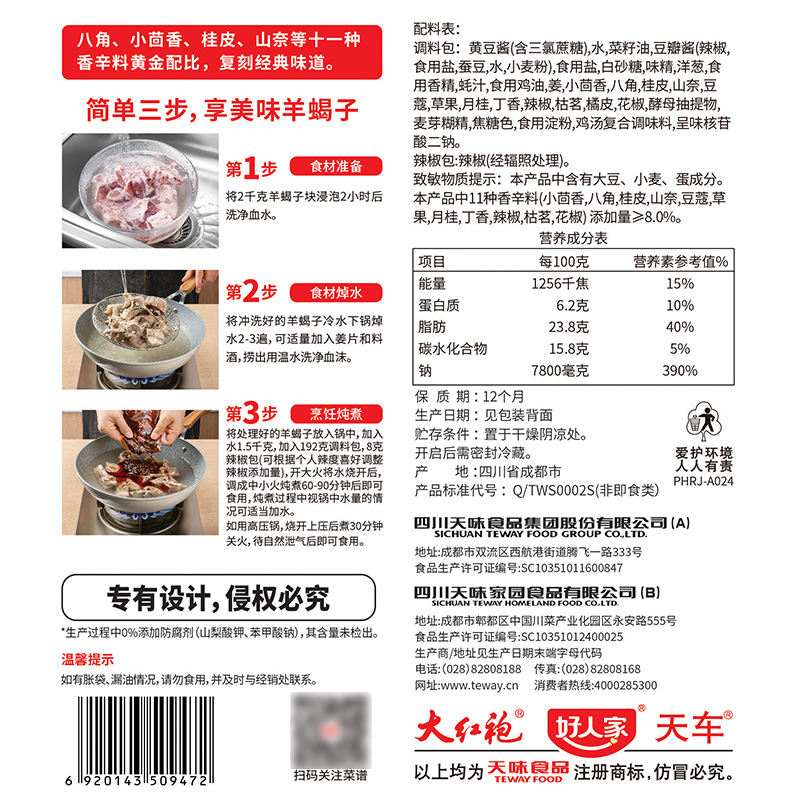 好人家羊蝎子调料200g香辣火锅底料老北京涮牛羊肉调味包炖料家用