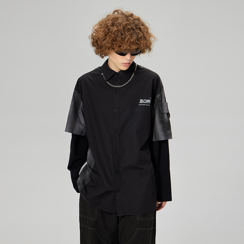 LAMLICKA假两件拼接撞色翻领长袖 男休闲秋街头潮衬衣外套宽松 衬衫