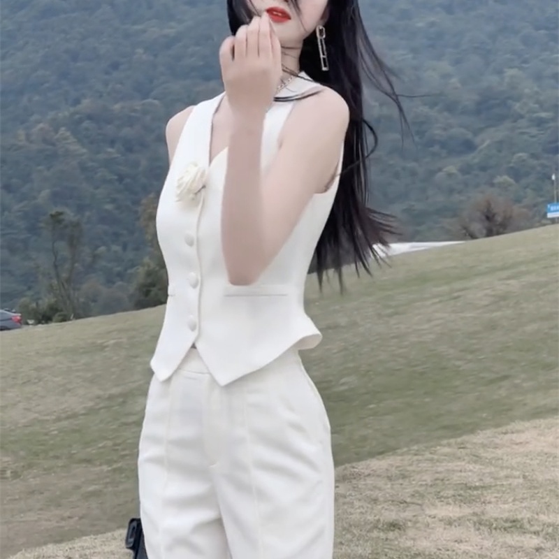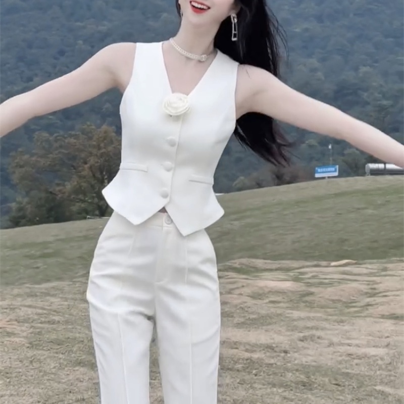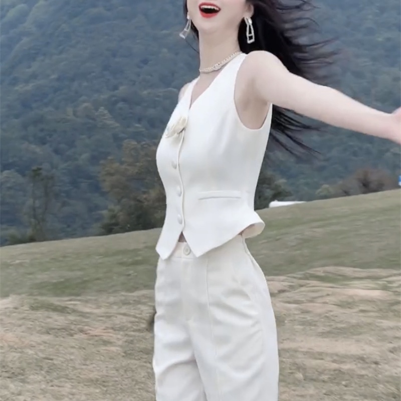 新款 显瘦阔腿裤 V领无袖 套装 两件套女 气质马甲名媛西装 2024年夏季