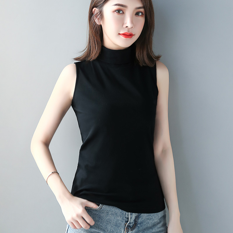 外穿t恤上衣春秋季 高弹性紧身修身 背心女内搭打底衫 黑色高领无袖