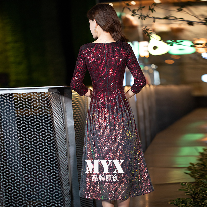一字肩晚礼服开衩亮片明星同款 长裙女 成人礼毕业连衣裙主持人晚装