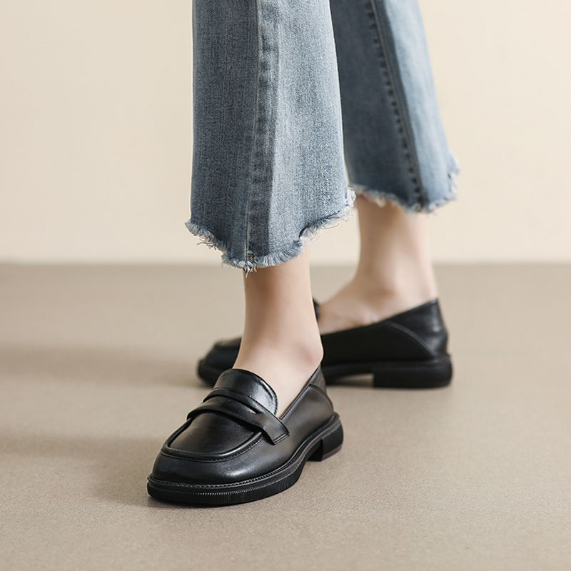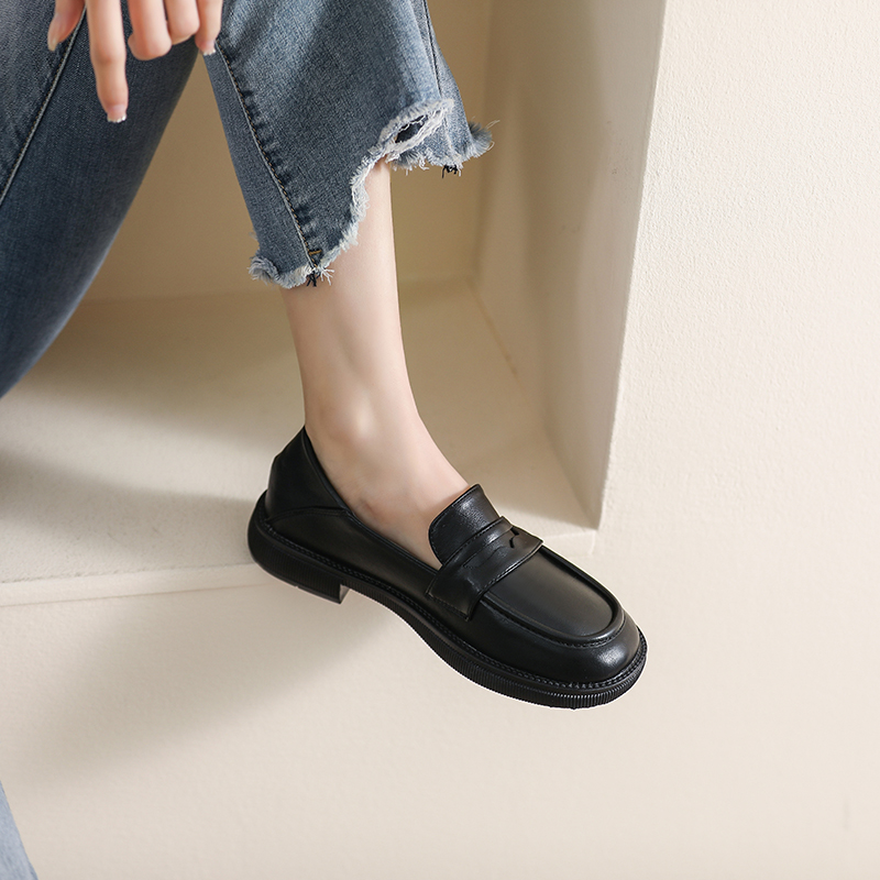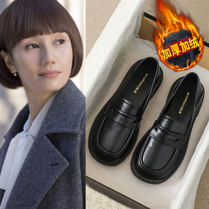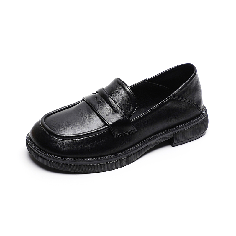 女2025秋季 真皮加绒乐福鞋 新款 大码 平底软底单鞋 黑色英伦风小皮鞋