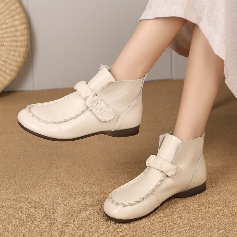 加绒大码 妈妈鞋 冬天靴子 复古休闲平底短靴女真皮软底软皮鞋 春秋季