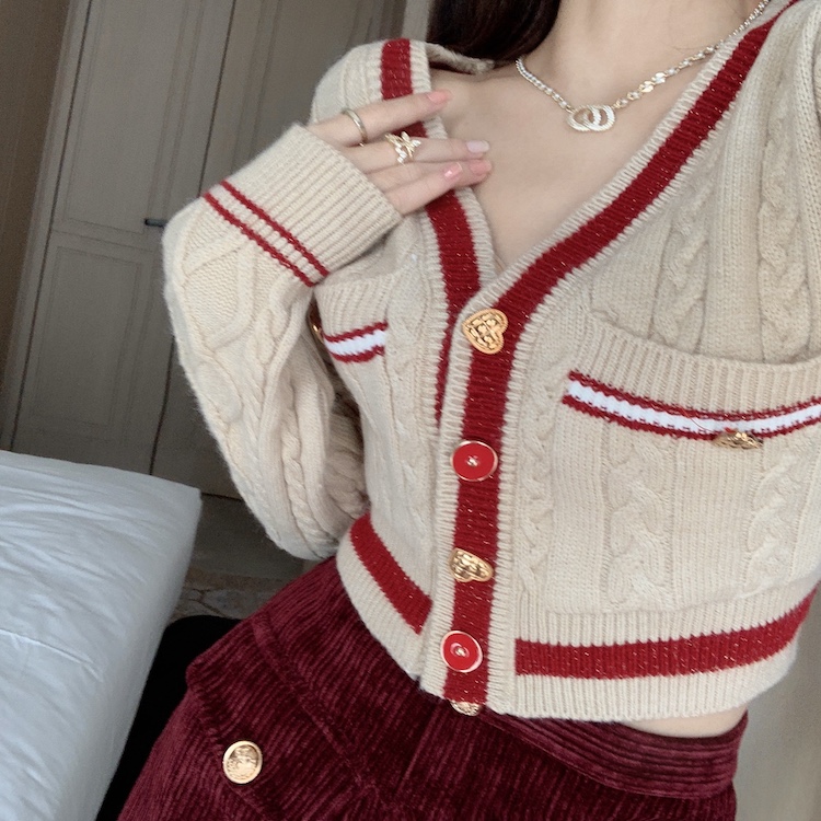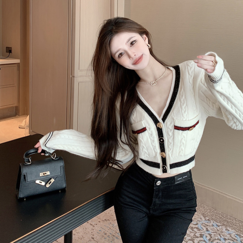 小香上衣 时髦撞色性感V领毛衣外套短款 气质减龄针织开衫 女秋冬款