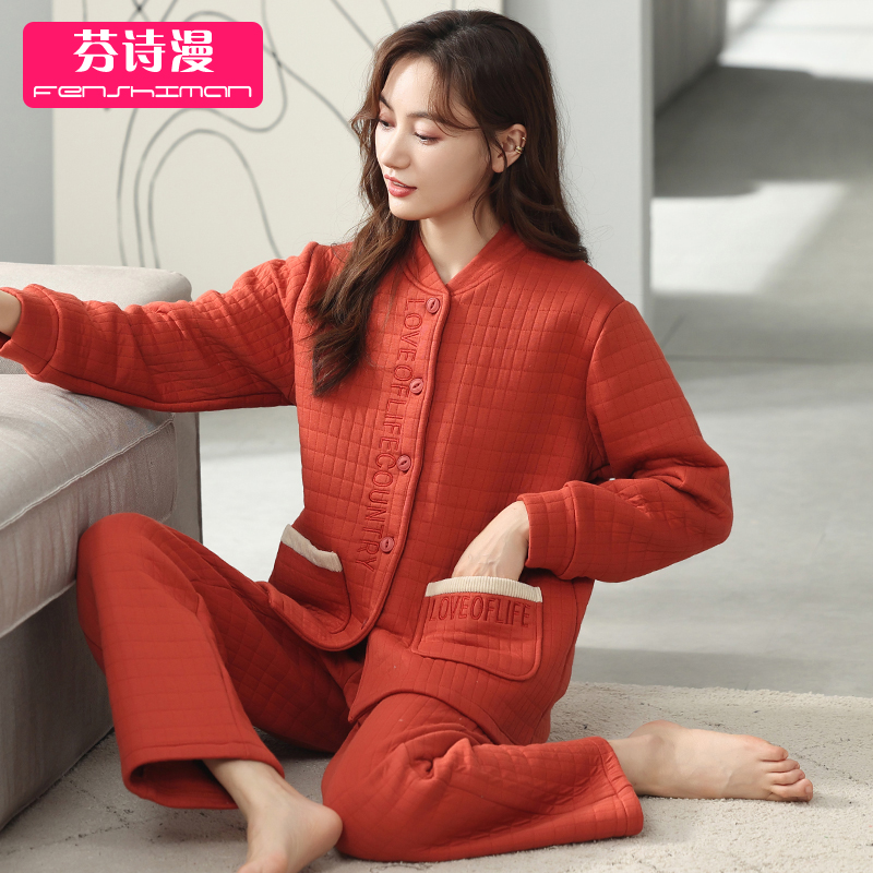 家居服 柔软宽松可外穿保暖长袖 三福女冬季 格子绒绒抗静电睡衣套装