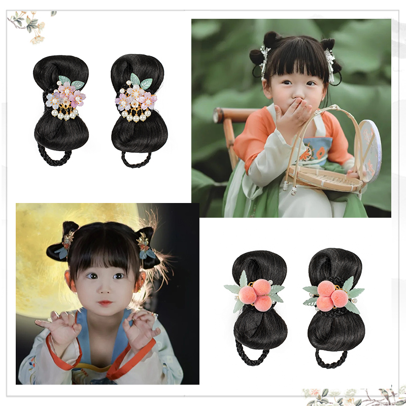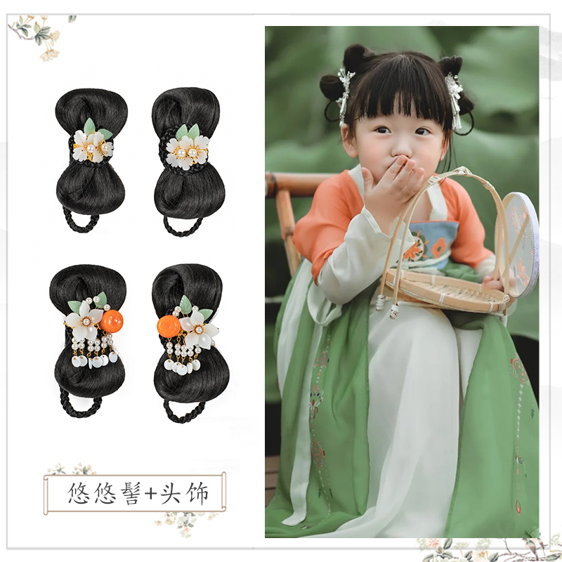 古风汉服儿童头饰假发女一体式 发髻可爱蝴蝶结假发包女童古风发饰