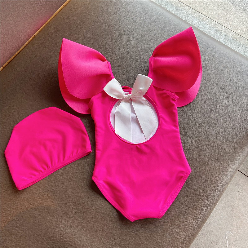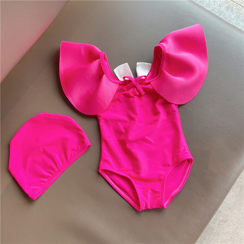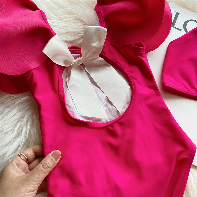 纯色背后亮面蝴蝶结露背大荷叶边新款 连体女童韩国bikini泳衣