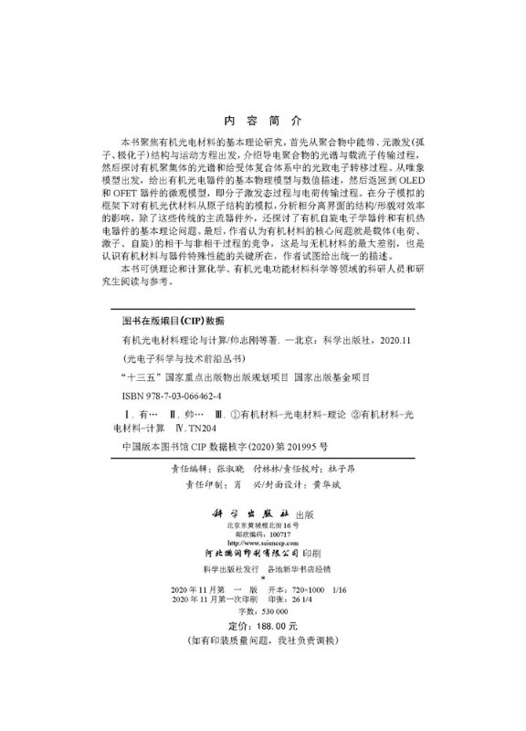 有机光电材料器件物理 有机高分子中载流子动力学 激发态与有机发光理论 帅志刚 有机光电材料理论与计算光电子科学与技术前沿丛书